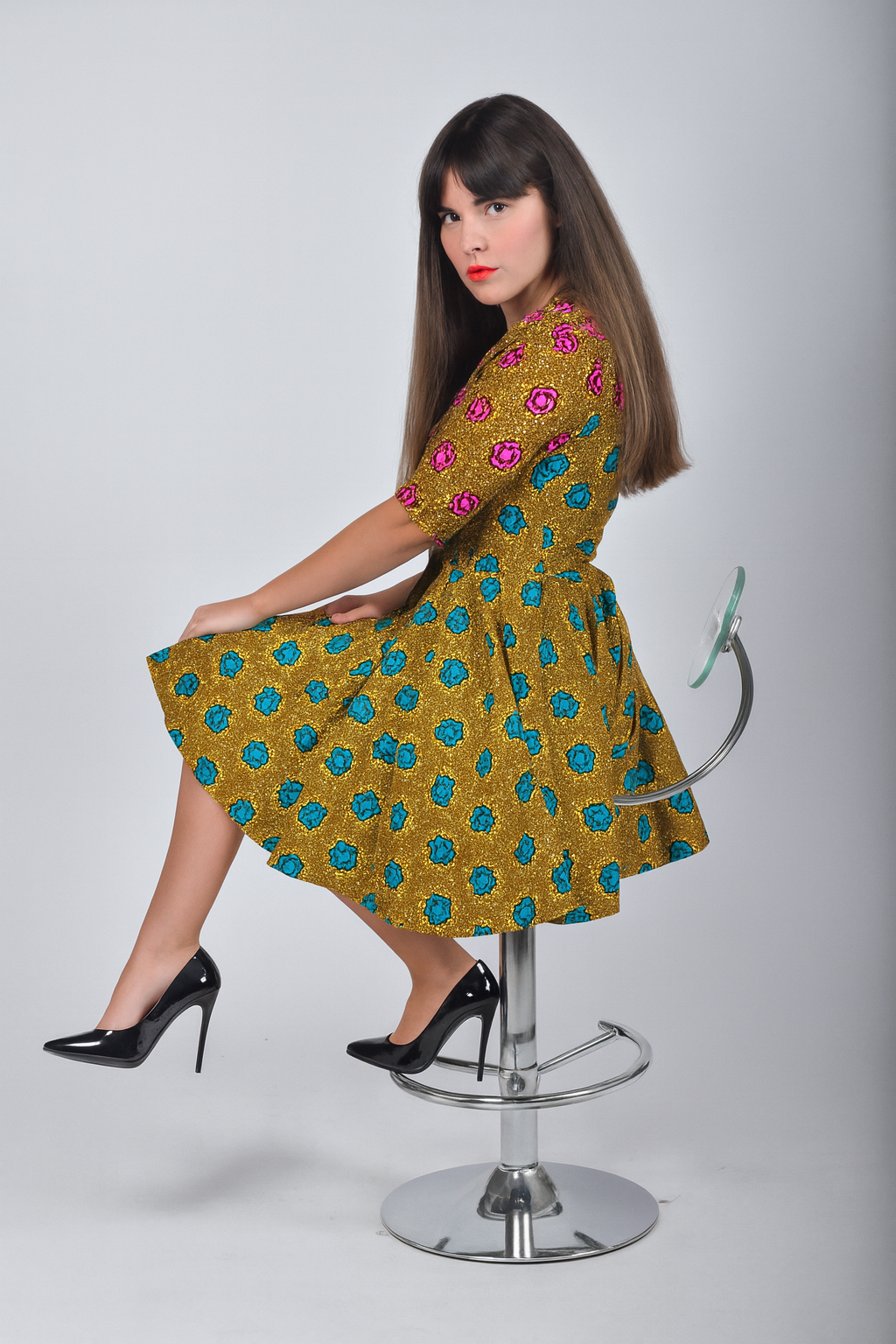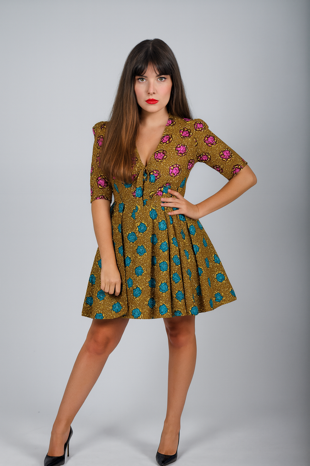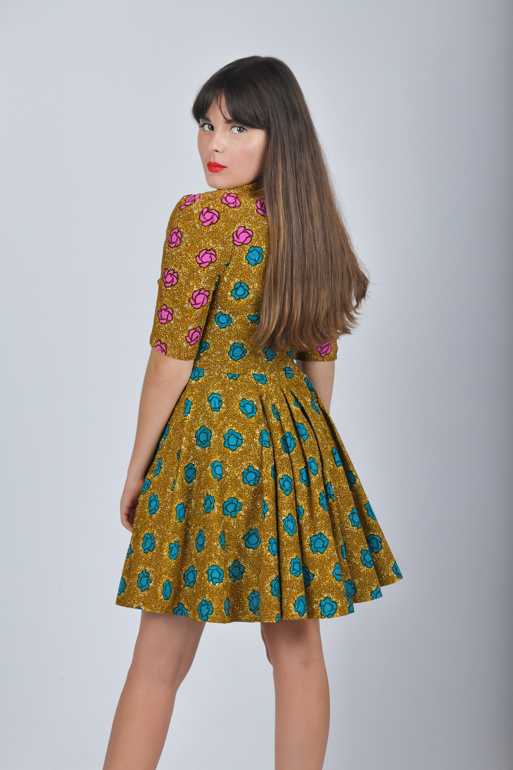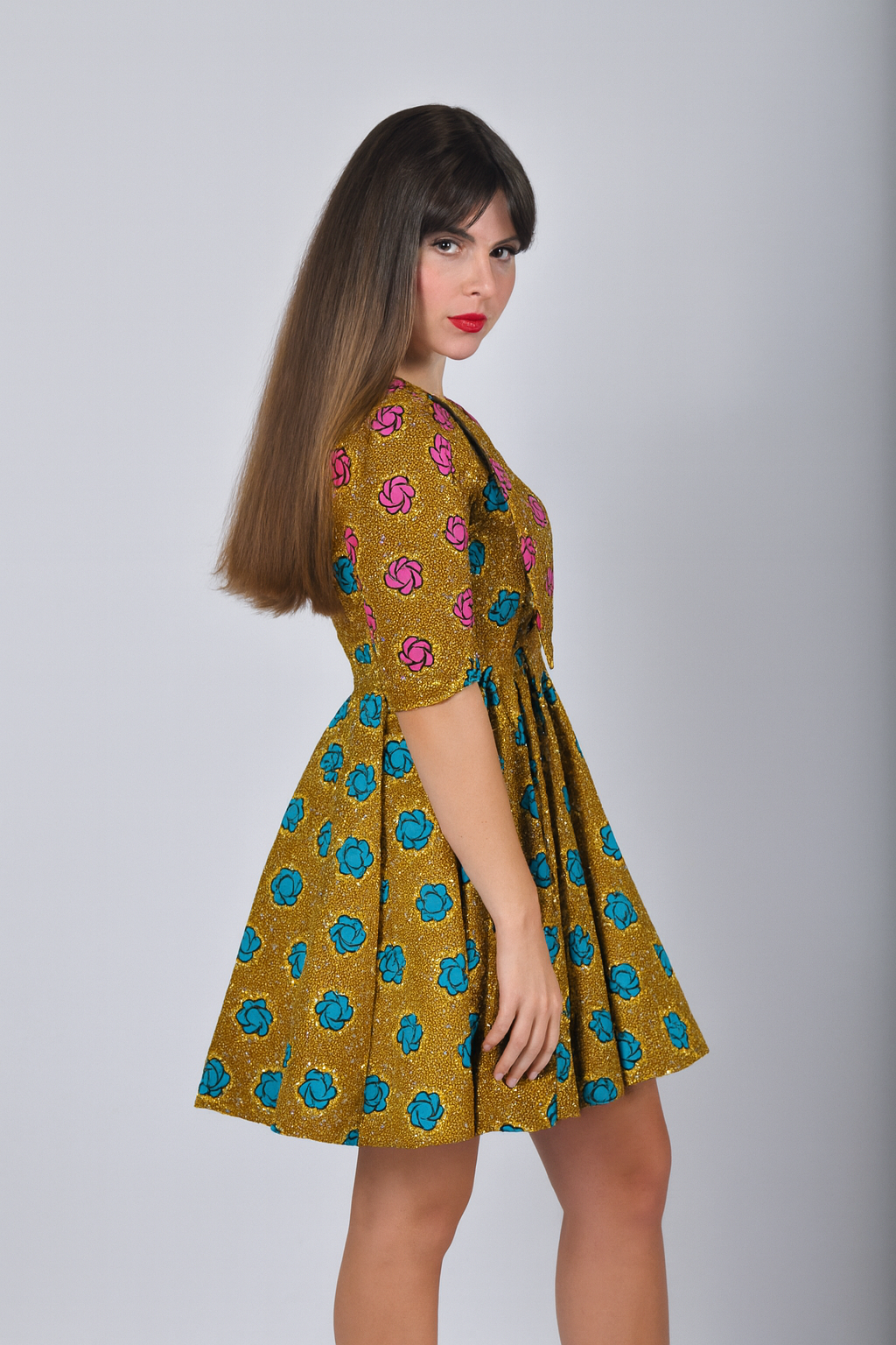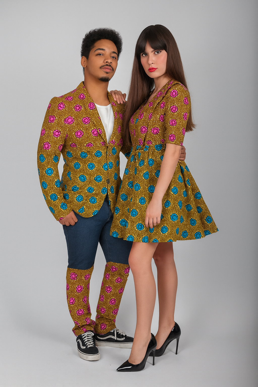 - Motifs : imprimés africains colorés (rose, bleu, doré)